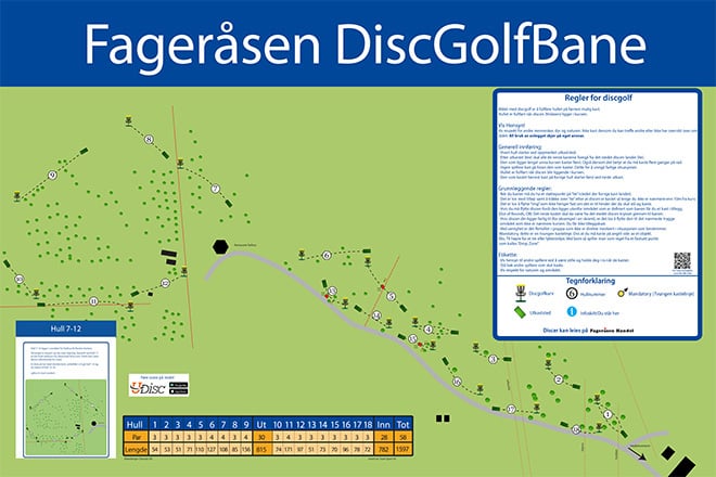 Banen i Fageråsen har 18 hull. Hull 7-12 ligger i området fra Fjellroa til Nordre Kanken. Terrenget er kupert og har mye stig ning. Spesielt ved hull 11 er det bratt nedover fra utkaststed til kurven. Dette kan være ekstra utfordrende for noen. Hull 7, 9 og 11 er nå par 4, disse var tidligere par 3. Er dere på tur med mindre barn, anbefaler vi å gå hull 1-6 og så videre til hull 13-18.