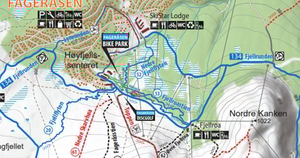 – Du fortsetter på Skarvboa helt opp til Nordre Kanken 1.022 moh. Mye fin utsikt! Deretter følger du grusveien sørover til området hvor det er avstigning Toppekspressen/Skihytta-Ekspress. Nå skal du følge veien som er merket Toppen på sykkelkartet i ca 500 meter. Når rød løype 58, Skarvboa, krysser veien, tar du til venstre, for så å klatre en kort bakke på Fageråsstien (57 svart), og deretter sykle ned Grønskaretstien (59 rød) til Fjellrunden, som du tar nordover et stykke før du avslutter med den morsomme, lekne Fjellflyten (20 blå).