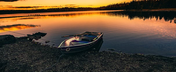 • Robåt dupper i vannkanten på Ørsjøen ved solnedgang